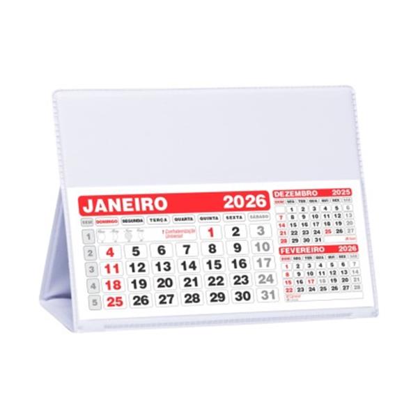 Calendário de mesa, confeccionado em PVC, disponível em diversas cores. Acompanha refil-calendário. Inclusa personalização por serigrafia em 01 cor. Tamanho grande, medindo 11,7 x 16,5 cm;