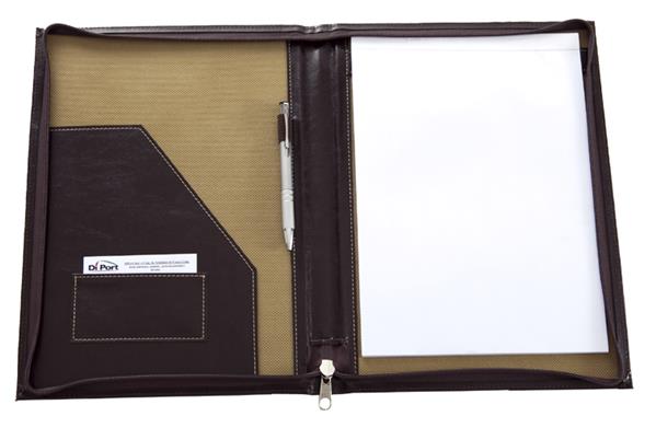 Pasta convenção tamanho A4 em couro sintético, acabamento em costura fechamento com ziper, com gravação logomarca em baixo relevo com espaço para bloco de anotações, folhas soltas, caneta e cartão. Medindo 255x345mm.